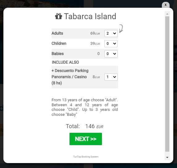 Once you have chosen the excursion, you must select how many people there will be (adults and children) and if you want to include extra services such as a discount on parking.