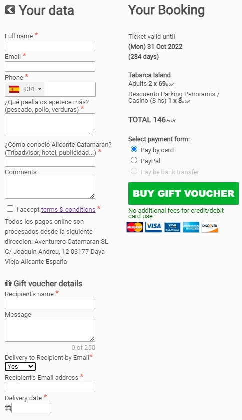 In the next step, you fill in your details and those of the recipient, to whom you can send the Gift Voucher by email and personalize a short message of congratulations. It is very important that you include the recipient's email, so they will receive the voucher with the complete information of the tour and a code to redeem it on the web.
