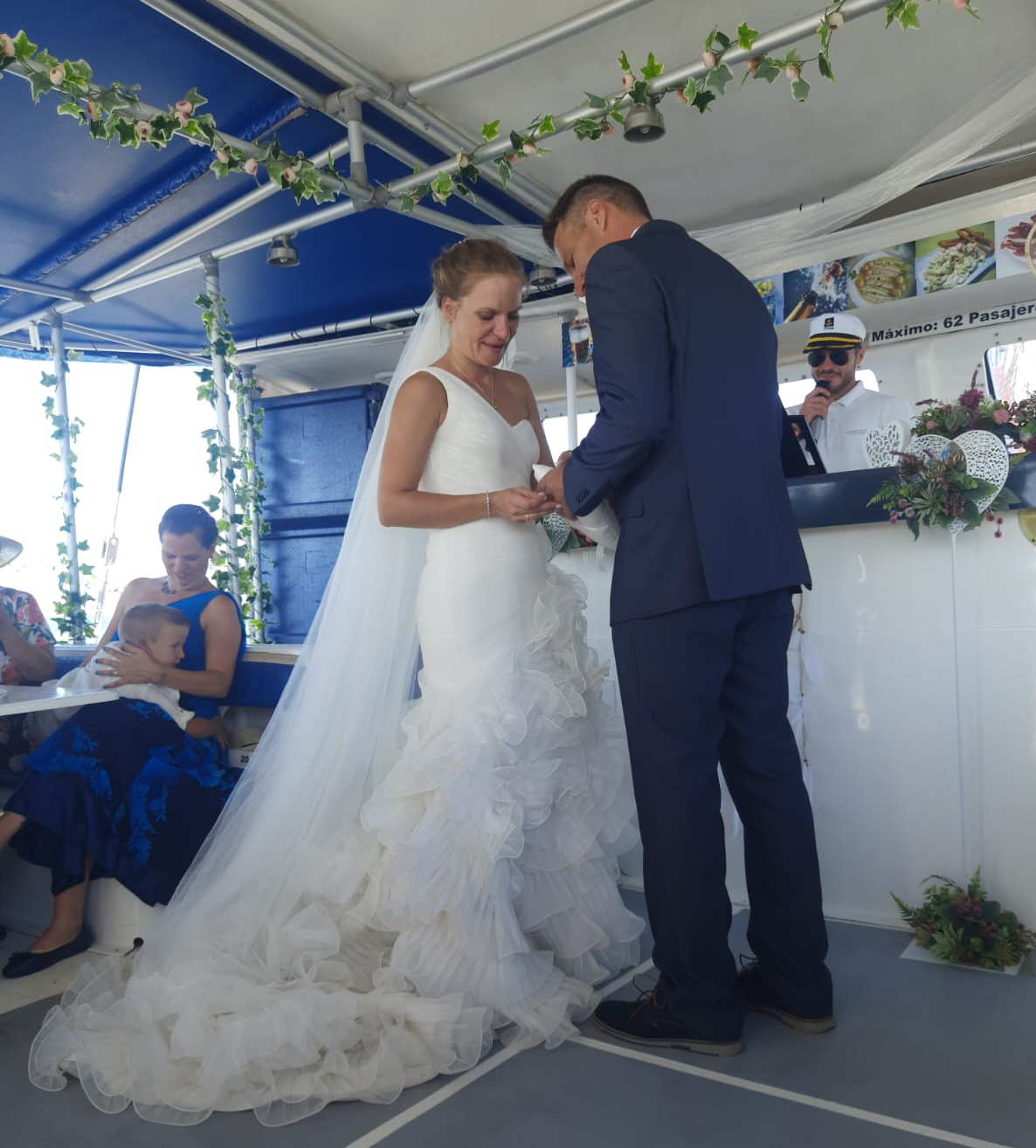 The boat fits both the emotional speech of the godparents, as well as the moment of partying with a DJ on board, and also, the wedding ceremony officiated by the captain.