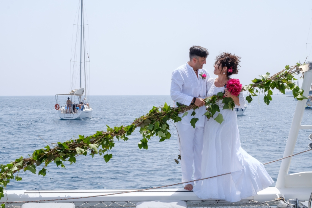 La embarcación se ajusta tanto al discurso emotivo de los padrinos, como al momento de fiesta con DJ a bordo, pasando por la ceremonia nupcial oficiada por el capitán. Puedes dar el sí quiero en el mar y personalizar el maxi catamarán, decorándolo de manera exquisita con flores de temporada, tonos claros y adaptarlo desde un momento sencillo y relajado hasta una velada más formal y elegante.